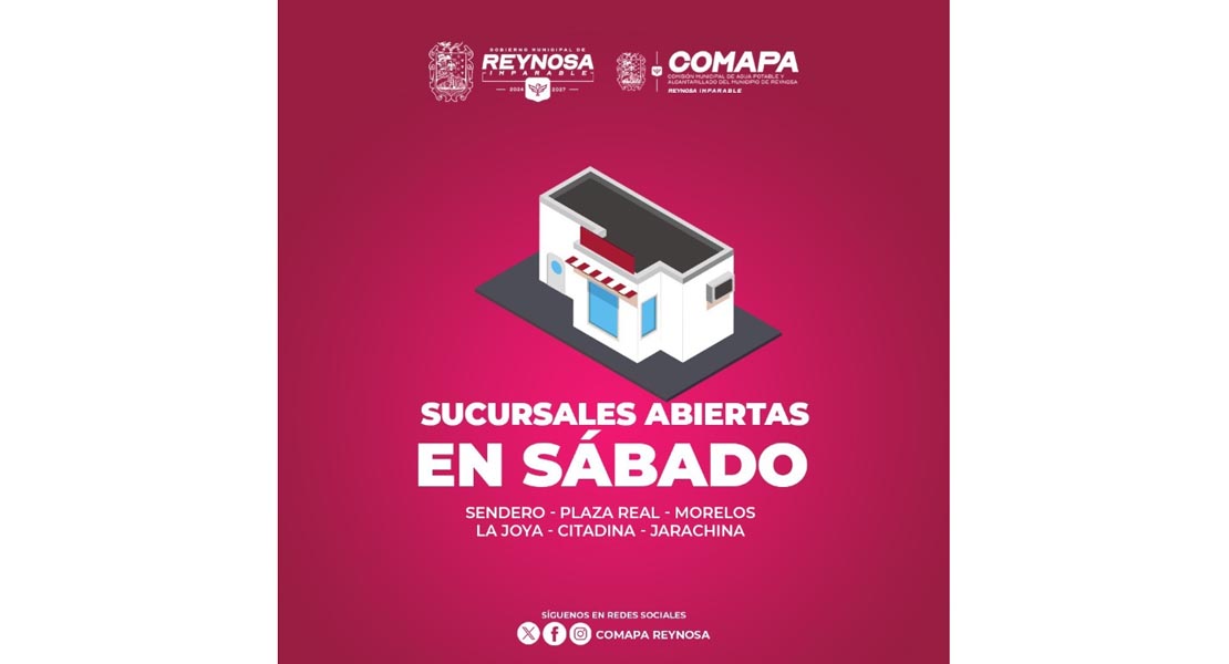 Reynosa, Tam.- La Comisión Municipal de Agua Potable y Alcantarillado de Reynosa invita a la ciudadanía a visitar las sucursales que permanecen abiertas en sábado para realizar el pago de los servicios de agua potable y drenaje, facilitando así que los usuarios puedan cumplir con este importante compromiso sin afectar sus actividades diarias. Las oficinas y horarios disponibles para atención son: Sucursal La Joya: de 9:00 A.M. a 2:00 P.M.; Sucursal Citadina: de 9:00 A.M. a 2:30 P.M.; Sucursales Periférico, Morelos, Plaza Real y Jarachina: de 8:00 A.M. a 2:30…