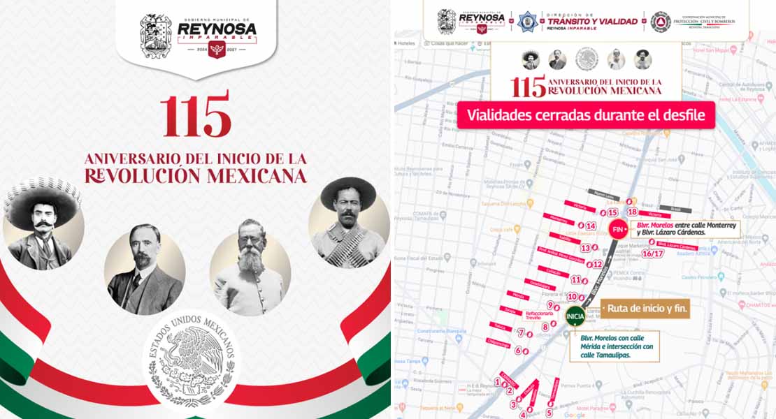 Conoce las calles cerradas este jueves 20 de noviembre. Reynosa, Tam.- El Gobierno Municipal de Reynosa, que preside Carlos Peña Ortiz, invita a la población a presenciar, este jueves 20 de noviembre, el Desfile Conmemorativo del 115 Aniversario del Inicio de la Revolución Mexicana, encabezado por las Fuerzas Armadas, al frente de 34 contingentes de corporaciones policiacas, clubes sociales, deportivos y escuelas locales, a partir de las 9:00 de la mañana. Conoce el cierre temporal de calles en el bulevar Morelos, por el Desfile y planea tus recorridos su tienes…