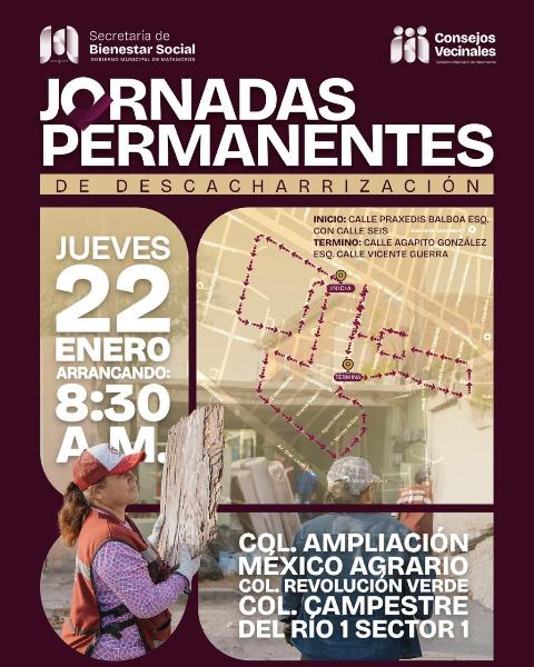 Matamoros, Tam.- El Gobierno de Beto Granados, a través de la Secretaría de Bienestar Social y en coordinación con los Consejos Vecinales, llevará a cabo las Jornadas Permanentes de Descacharrización este jueves 22 de enero, con el objetivo de prevenir enfermedades transmitidas por vectores y fortalecer la salud pública en Matamoros. Las acciones darán inicio a las 8:30 de la mañana y se desarrollarán en las colonias Ampliación México Agrario, Revolución Verde y Campestre del Río, Sector 1, donde se realizará el retiro de objetos en desuso que puedan acumular…