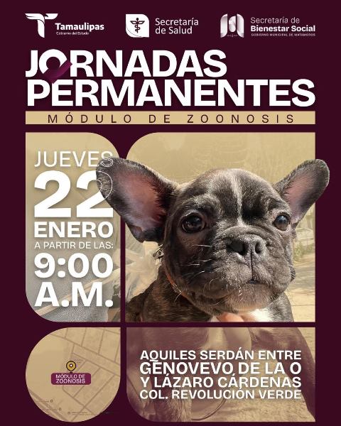 H. Matamoros, Tamaulipas.- Con el objetivo de promover el cuidado, la protección y el bienestar de las mascotas, el Gobierno de Beto Granados llevará a cabo las Jornadas Permanentes del Módulo de Zoonosis, una campaña enfocada en brindar servicios gratuitos de vacunación y atención preventiva para perros y gatos, contribuyendo así a la salud pública y al control sanitario en la ciudad. Estas acciones tienen como importancia el prevenir enfermedades zoonóticas, fomentar la tenencia responsable de animales de compañía y fortalecer una cultura de prevención que impacte positivamente tanto en…
