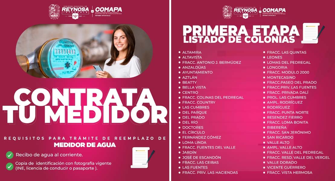 Reynosa, Tam.- La Comisión Municipal de Agua Potable y Alcantarillado de Reynosa informa que, a partir de febrero, se aplicará un consumo fijo de 25 metros cúbicos mensuales a los usuarios que no cuenten con medidor de agua o cuyo dispositivo no funcione, conforme a lo establecido en el contrato de servicios. Esta medida iniciará en 52 colonias, con el objetivo de regularizar el consumo y fortalecer el uso responsable del agua. COMAPA exhorta a los usuarios a instalar su medidor, ya que el consumo promedio medido en estas zonas…