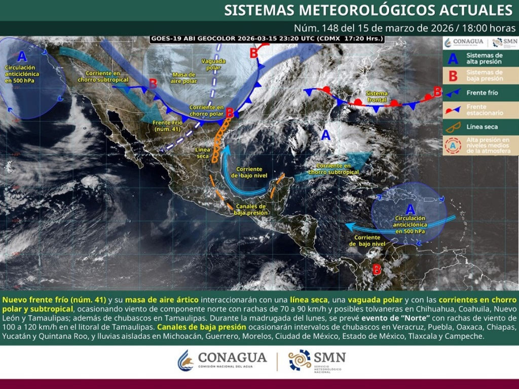 Matamoros, Tam.- La Dirección de Protección Civil y Bomberos de Matamoros informa que para este lunes 16 de marzo, se espera el ingreso del Frente Frío No. 41, generando condiciones de riesgo por ráfagas de viento. LO QUE DEBES SABER: Ráfagas: Se esperan rachas de viento de entre 70 y 90 km/h. Temperatura: Descenso térmico con mínimas de 16°C. ACCIONES DE AUTOPROTECCIÓN: ✅ Asegura tu hogar: Sujeta láminas, botes, macetas o cualquier objeto suelto en techos o patios. ✅ Al conducir: Reduce la velocidad y mantén ambas manos al volante;…