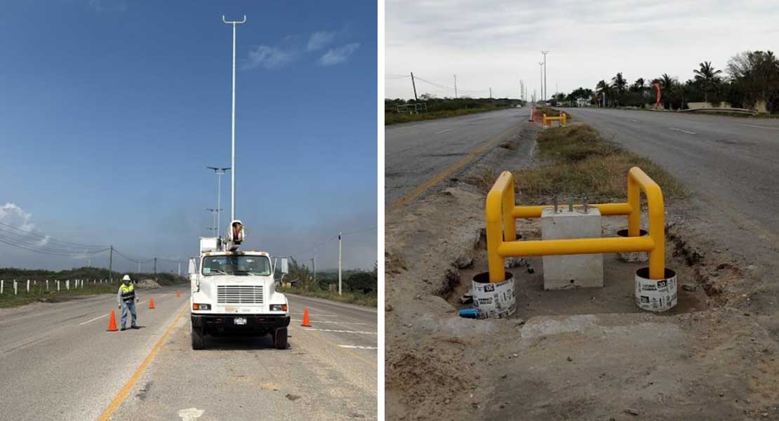 Destacó que, esta red de alumbrado público cuenta con 128 postes y 256 luminarias y en la última etapa de la obra, se construyeron las bases de concreto hidráulico para instalar los postes metálicos galvanizados colocando 28 lámparas solares en la parte de Altamira, mientras que en la zona de Ciudad Madero se realizaron las mismas labores con instalación de 34 lámparas para terminar la obra en esta importante avenida.
