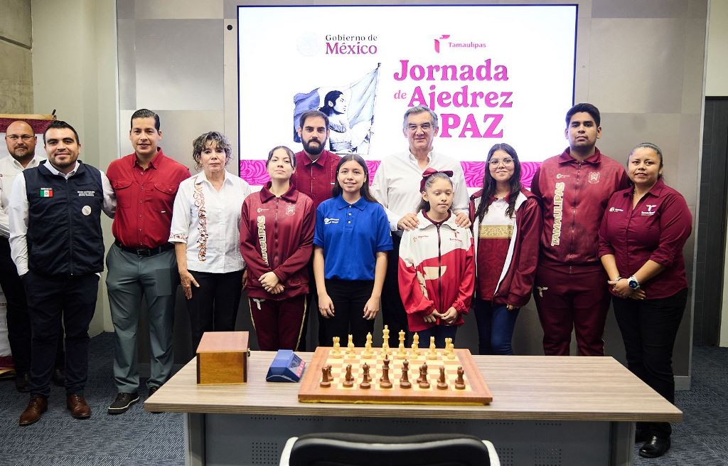 Como parte de la Jornada de Ajedrez por la Paz, y ante la presencia de las y los integrantes de la Mesa de Coordinación para la Construcción de Paz, el gobernador sostuvo una partida con Daniela Ordoñez Alarcón, de Altamira, quien recientemente logró coronarse campeona nacional de ajedrez en Querétaro, y representará a México en el Campeonato Panamericano, a celebrarse en Canadá.