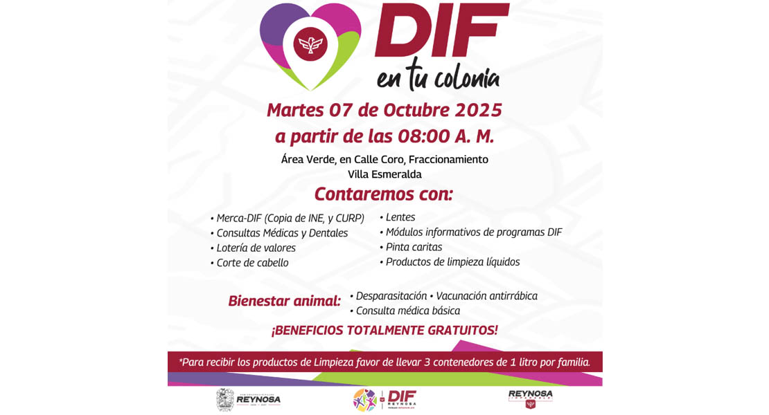 Reynosa, Tam.- Por instrucciones del Alcalde, Carlos Peña Ortiz, el Sistema DIF-Reynosa que preside Carlos Luis Peña Garza, llevará una nueva brigada del programa “DIF en Tu Colonia” al fraccionamiento Villa Esmeralda, este martes 7 de octubre, a partir de las 8:00 de la mañana, en el área verde ubicada sobre la calle Coro.