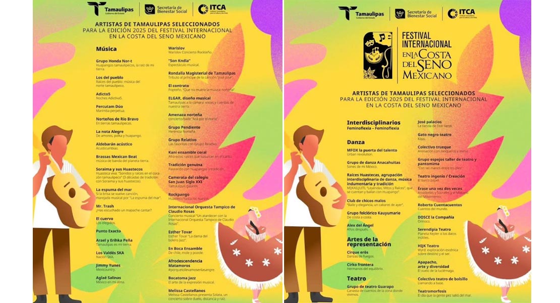 Ciudad Victoria, Tamaulipas.- Después de una exhaustiva revisión de los 167 proyectos recibidos, ayer 7 de julio, conforme a lo establecido en la convocatoria, se dio a conocer la lista de artistas y agrupaciones tamaulipecas que formarán parte de la edición 2025 del Festival Internacional en la Costa del Seno Mexicano.