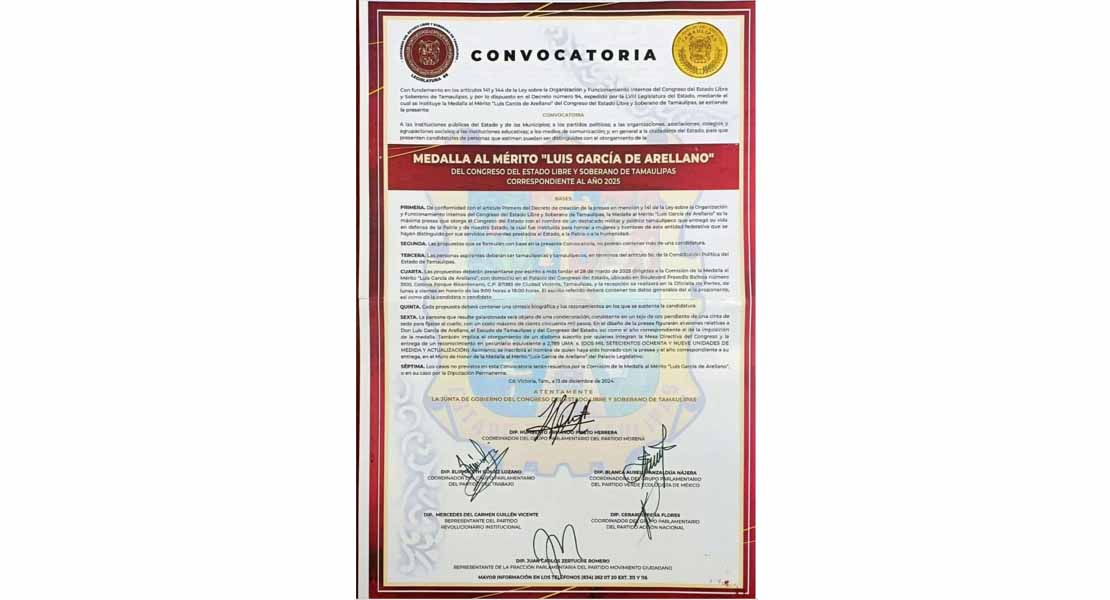 En atención a la solicitud de mi amiga la Diputada Marina Ramírez Andrade, Presidenta de la Comisión de la Medalla al Mérito Luis García de Arellano del Poder Legislativo de Tamaulipas, los invito a que conozcan las bases y demás pormenores de este importante reconocimiento, que honra a quienes han destacado por su trayectoria y aportaciones en beneficio de nuestro Estado.