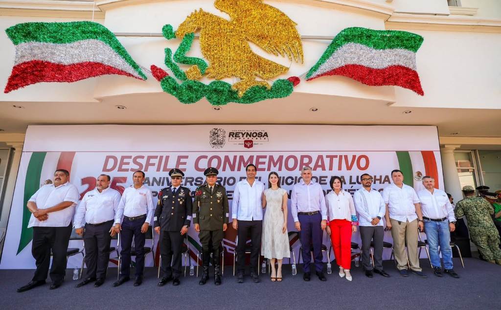 Los coloridos contingentes escolares y de corporaciones de seguridad en Reynosa, encabezados por las Fuerzas Armadas, Guardia Nacional, Policía Vial y Protección Civil y Bomberos, desfilaron ante los asistentes, entre ellos la Diputada Federal, Olga Juliana Elizondo Guerra; el Diputado Local, Juan Carlos Zertuche Romero; Ricardo Martínez Cavada, Agente MPF; Coronel de Infantería DEM Milton Carlos Pantaleón Rocha, Comandante del 12⁰ Batallón de la GN; Jorge Guadalupe Acuña Tovías, del SNTE; Héctor Alejandro Olivares Zavala, Secretario de Bienestar Social Municipal, y las familias reynosenses.