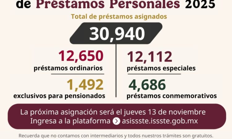 Ciudad de México.- El Instituto de Seguridad y Servicios Sociales de los Trabajadores del Estado (ISSSTE), encabezado por el director general Martí Batres Guadarrama, informa que se asignaron 30 mil 940 créditos en el Programa Anual de Préstamos Personales 2025, para todos aquellos que cumplieron los requisitos.