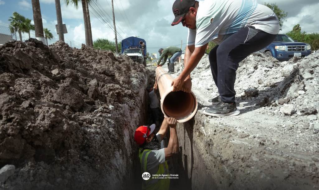 H. Matamoros, Tamaulipas.- El alcalde Beto Granados supervisó los avances de la obra de rehabilitación de la línea sanitaria en la carretera Sendero Nacional, donde se instala tubería de 12 pulgadas para mejorar el servicio y prevenir futuros colapsos.
