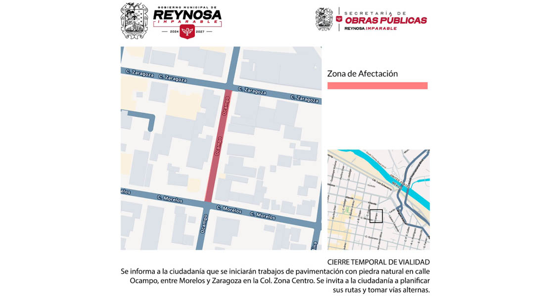 Reynosa, Tam.- Se informa a la ciudadanía que la calle Ocampo, entre Morelos y Zaragoza en la Zona Centro, permanecerá cerrada temporalmente debido al inicio de trabajo de recubrimiento con piedra natural.