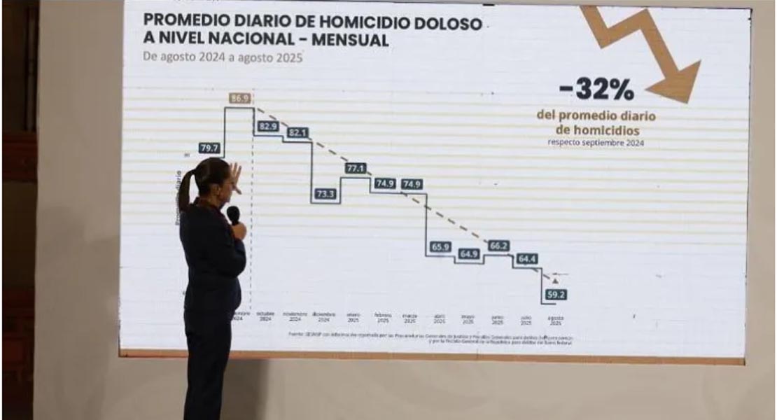 Ciudad de México.- El Gobierno de México dio a conocer este 9 de septiembre que los homicidios dolosos registraron una reducción del 32% en agosto de 2025 respecto al mismo mes del año pasado y en lo que va del sexenio. Según las cifras reveladas por el Gabinete de Seguridad durante “La Mañanera del pueblo” de la Presidenta Claudia Sheinbaum este martes, al pasar de un promedio diario de 86.9 víctimas a 59.2. Este descenso equivale a 27 homicidios menos en comparación con septiembre de 2024, y que convierte al de 2025 en el mes de agosto con menor incidencia en este delito desde 2015.