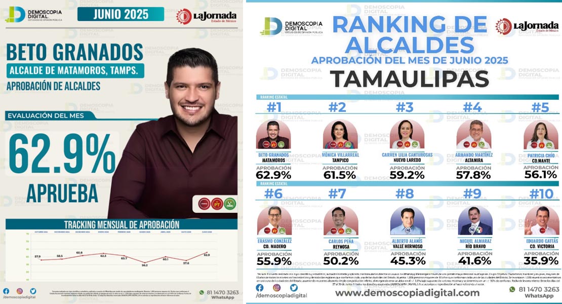 Matamoros, Tam.- En el más reciente estudio de la encuestadora Demoscopia, el alcalde de Matamoros Beto Granados, ocupa el 1er. lugar de aprobación ciudadana en el estado de Tamaulipas con un porcentaje de 62.9%.