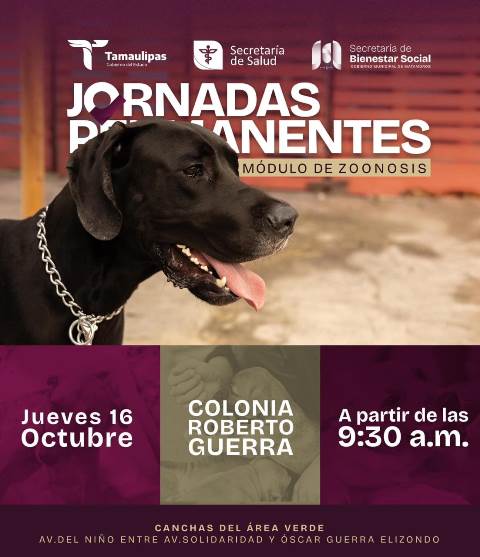 H. Matamoros, Tamaulipas.- En cumplimiento del compromiso con el bienestar de las familias, este jueves 16 de octubre el Módulo de Zoonosis estará brindando atención en la colonia Roberto Guerra, a partir de las 9:30 de la mañana, en las canchas del área verde ubicada en Avenida del Niño entre Av. Solidaridad y Oscar Guerra Elizondo.