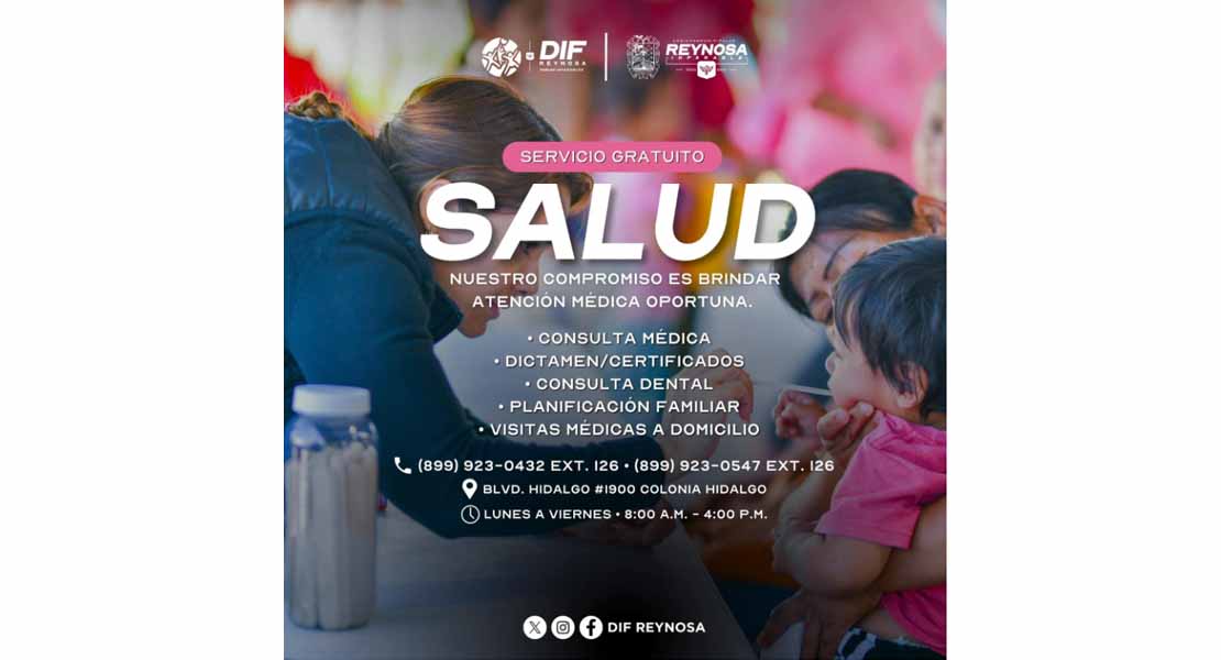Reynosa, Tam.- Con el compromiso de mejorar la salud y calidad de vida de las familias, el Sistema DIF-Reynosa, que preside Carlos Luis Peña Garza, ofrece a través del área de salud, atención médica, dental y orientación en planificación familiar, priorizando el bienestar integral de cada persona.