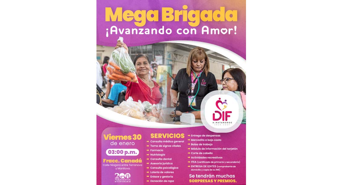 Matamoros, Tam.- El Sistema DIF Matamoros que preside la Lic. Ana Ariceaga de Granados, invitan a las familias del Fraccionamiento Canadá y alrededores, a asistir a la Mega Brigada Asistencial, en donde se acercarán los diversos servicios que se ofrecen de manera gratuita. Esta actividad se llevará a cabo en el área verde del Fracc. Canadá ubicado en Calle Niagara entre Calle Manitova y Terranova, el día viernes 30 de enero a partir de las 03:00 de la tarde. Durante esta jornada, se ofrecerá a la población en general consulta…