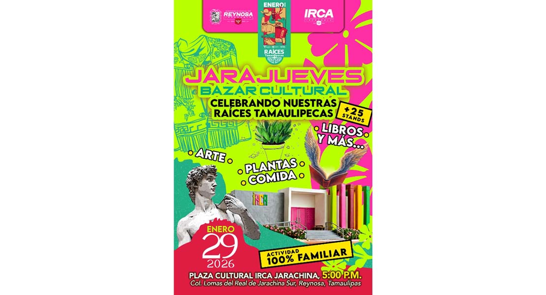 Reynosa, Tam.- El Gobierno de Reynosa, que preside el Alcalde Carlos Peña Ortiz, invita a la ciudadanía a conmemorar el orgullo de nuestra identidad en el marco del mes dedicado a las Raíces Tamaulipecas este 29 de enero en la Plaza Cultural IRCA Jarachina a las 5:00 P. M. Para esta ocasión, el Instituto Reynosense para la Cultura y las Artes ha organizado una programación artística donde la cultura y el talento local se integran como los componentes principales del tradicional “Jarajueves”. En esta edición correspondiente al mes de enero…
