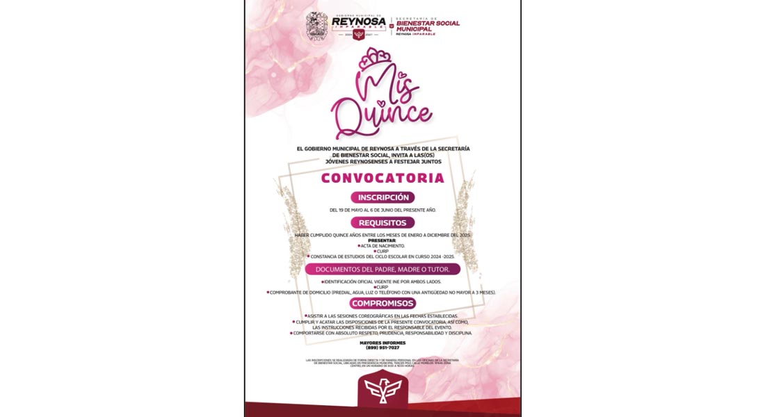 Reynosa, Tam.- El Gobierno que preside el Alcalde Carlos Peña Ortiz, invita a través de la Secretaría de Bienestar Social, a jovencitas y jóvenes reynosenses a participar en la Convocatoria “Mis Quince”, para celebrar a quienes cumplen 15 años este 2025.