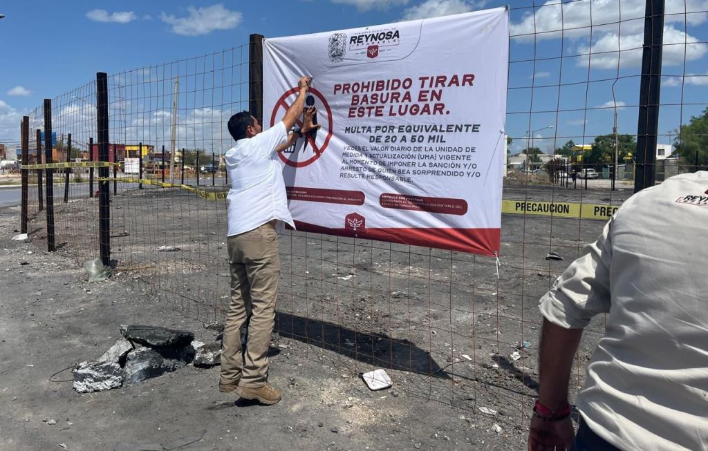 Reynosa, Tam.- La Secretaría de Desarrollo Urbano y Medio Ambiente del Gobierno Municipal de Reynosa clausuró el predio del bulevar Alcalá en la colonia Balcones de Alcalá, donde ilegalmente eran depositados llantas y basura.