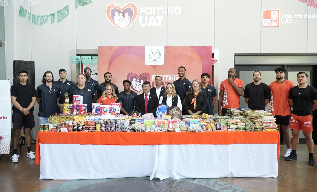 Ciudad Victoria, Tam.– El rector de la Universidad Autónoma de Tamaulipas, Dámaso Anaya Alvarado, acompañado de su esposa, la Lic. Isolda Rendón de Anaya, presidenta de Familia UAT, recibió, del Club Correcaminos de basquetbol profesional (Correbasket), un donativo de víveres y útiles escolares recaudados por el equipo durante sus encuentros en el Gimnasio Multidisciplinario de Victoria, dentro de la Temporada 2025 de la Liga Caliente MX LNBP.