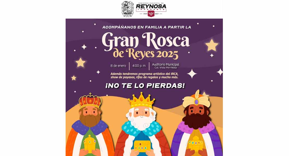 Reynosa, Tam.- Mañana miércoles 8 de enero, el Presidente Municipal Carlos Peña Ortiz te invita a disfrutar de la Gran Rosca de Reyes en el Auditorio Municipal de Vista Hermosa, donde la fiesta inicia a las 4:00 de la tarde y promete ser una celebración Imparable para todas las familias reynosenses.