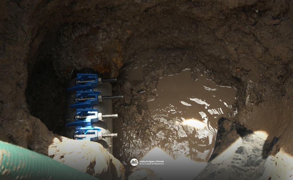 H. Matamoros, Tamaulipas.- El Gobierno de Beto Granados, a través de la Junta de Aguas y Drenaje, realizó la reparación de una fuga de agua en la colonia Moderna.