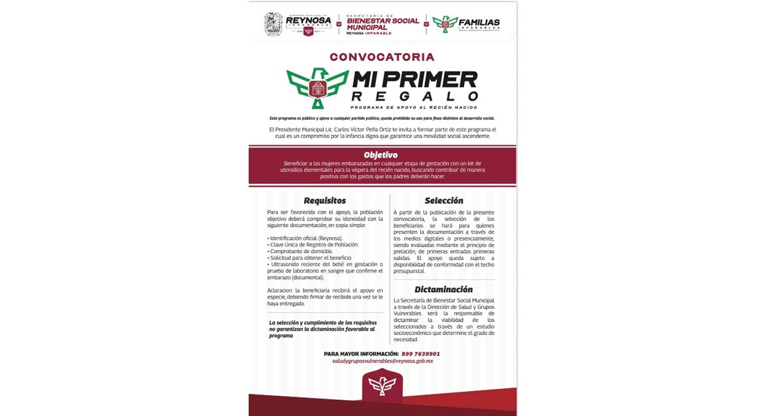 Reynosa, Tam.- El Presidente Municipal Carlos Peña Ortiz convoca a las mujeres embarazadas a inscribirse al programa de la Secretaría de Bienestar Social Municipal “Mi Primer Regalo”, dirigido a residentes de esta localidad que podrán recibir el beneficio mediante el cumplimiento de sencillos requisitos.