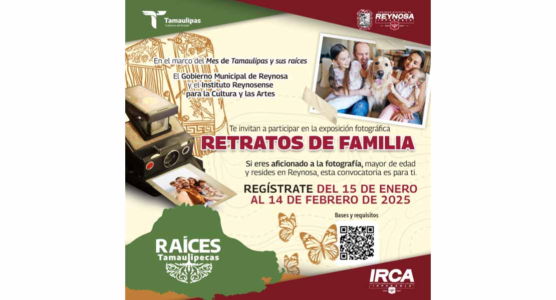 Reynosa, Tam.- En el marco del Mes de Tamaulipas y sus Raíces, el Gobierno de Reynosa, que preside el Alcalde Carlos Peña Ortiz y el Instituto Reynosense para la Cultura y las Artes, invitan a participar en la exposición fotográfica “Retratos de Familia”, dirigida a aficionados a la fotografía a fin de que muestren su talento capturando la vida cotidiana de las familias reynosenses.