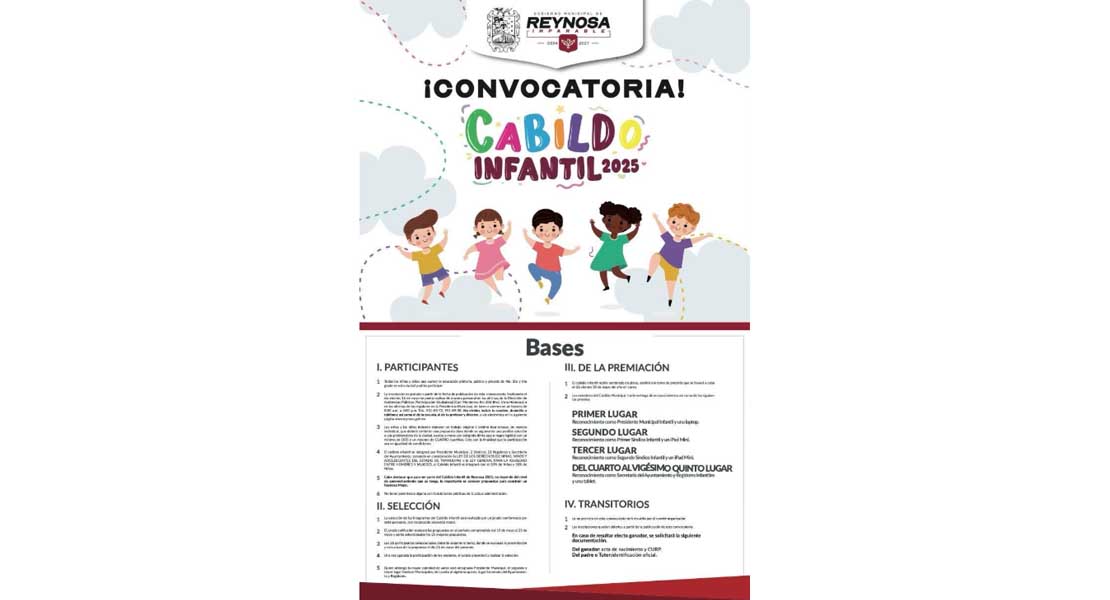 Reynosa, Tam.- El Presidente Municipal de Reynosa, Carlos Peña Ortiz, invita a todos los niños y niñas que cursen la educación primaria, pública y privada, de Cuarto, Quinto y Sexto Grado, en esta ciudad, a participar en la Convocatoria Cabildo Infantil 2025.