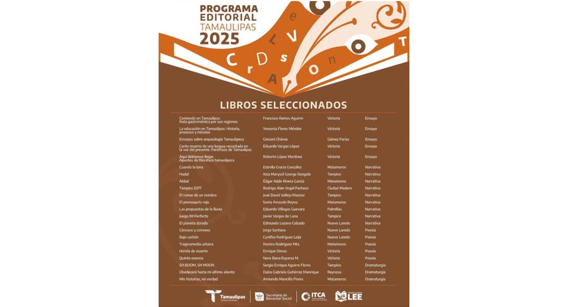 Autores de Nuevo Laredo, Ciudad Victoria, Matamoros, Reynosa, Tampico, Ciudad Madero, Gómez Farías y Palmillas fueron seleccionados en la convocatoria.