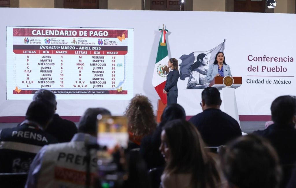 Ciudad de México.- Durante la conferencia matutina: “Las mañaneras del pueblo”, que encabeza la Presidenta Claudia Sheinbaum Pardo en Palacio Nacional, la secretaria de Bienestar, Ariadna Montiel Reyes, informó que del 3 al 27 de marzo se realiza la dispersión del pago de las Pensiones y Programas para el Bienestar correspondiente al bimestre marzo-abril a 15.2 millones de derechohabientes adultos mayores, mujeres bienestar, personas con discapacidad y madres trabajadoras, con inversión social de 87 mil 068.9 millones de pesos.
