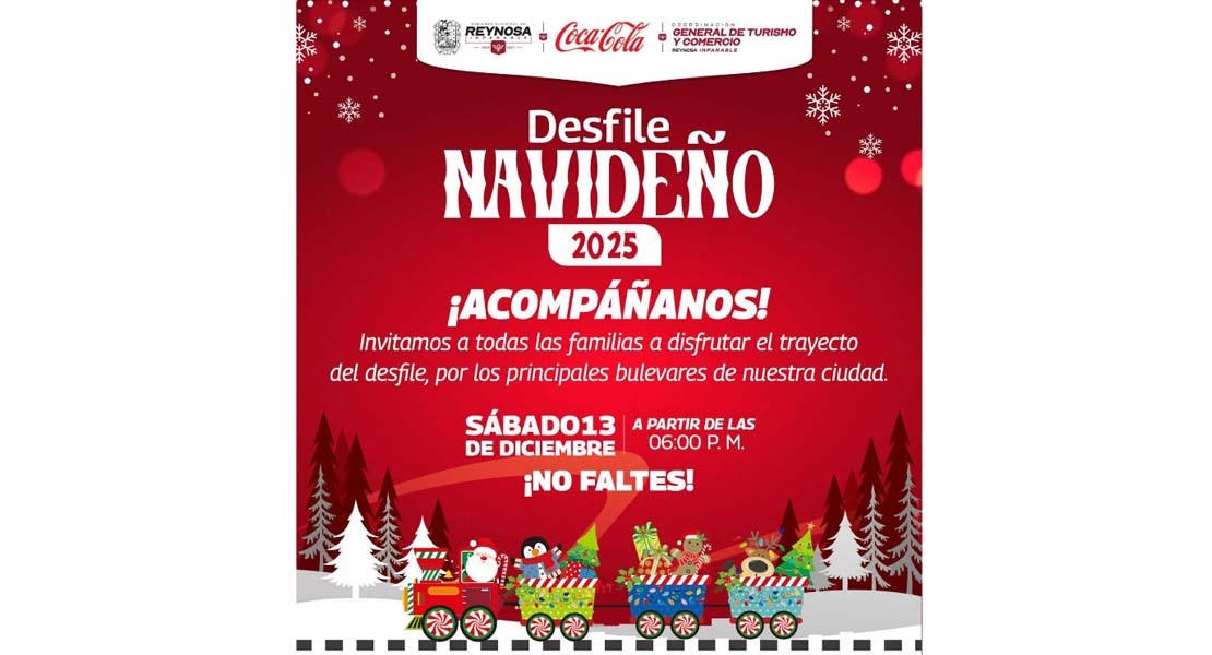 Reynosa, Tam.- El Presidente Municipal Carlos Peña Ortiz invita a toda la población a disfrutar del gran Desfile Navideño 2025, que a partir de las 6:00 de la tarde partirá del circuito vial Periférico, para recorrer el bulevar Miguel Hidalgo con más de 100 carros alegóricos y la tradicional Caravana de Arca Continental con sus clásicos personajes.