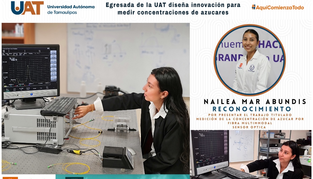 Reynosa, Tam.- La joven Nailea Mar Abundis, egresada de Ingeniería en Electrónica de la Universidad Autónoma de Tamaulipas (UAT), diseñó un sensor que permite mejorar la detección de los niveles de azúcares en alimentos y bebidas, el cual fue presentado con éxito en un evento internacional y ha sido publicado en una prestigiada red de ediciones científicas con base en Suiza.
