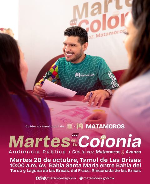 H. Matamoros, Tamaulipas.- Este martes, el programa “Martes en tu Colonia” llegará al Tamul de Las Brisas, donde a partir de las 10:00 de la mañana los vecinos podrán acercarse para compartir sus planteamientos, inquietudes y propuestas directamente con las autoridades municipales.