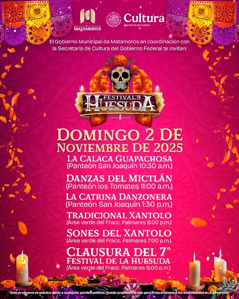 H. Matamoros, Tamaulipas.- El Festival de la huesuda 2025 llega a su gran cierre este domingo, con una jornada llena de color, música y tradición que despide con orgullo una de las celebraciones más significativas de nuestra identidad matamorense; habrá varios eventos, sin embargo, la clausura será a las 8:00 p.m. en el área verde del Fraccionamiento Palmares.