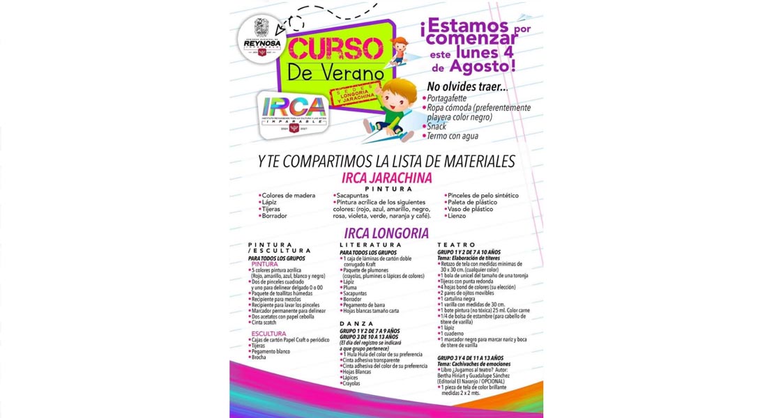 Reynosa, Tam.- Este lunes 4 de agosto, las sedes Longoria y Jarachina del Instituto Reynosense para la Cultura y las Artes darán la bienvenida a quienes vivirán una experiencia llena aprendizaje y creatividad, impulsada por el Alcalde Carlos Peña Ortiz.