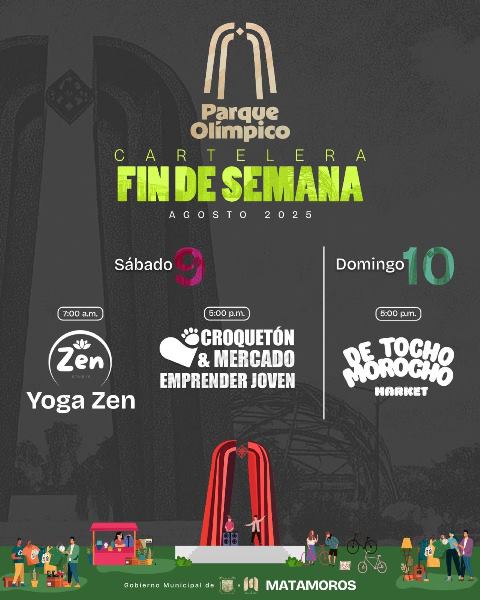 Matamoros, Tamaulipas.- Este sábado 9 y domingo 10 de agosto, el Parque Olímpico Cultura y Conocimiento será el escenario de diversas actividades que combinan bienestar, emprendimiento y arte local. El gobierno de Beto Granados te invita este fin de semana, el Parque Olímpico Cultura y Conocimiento será el punto de encuentro para quienes buscan comenzar el día con energía, apoyar causas nobles y disfrutar del talento local.
