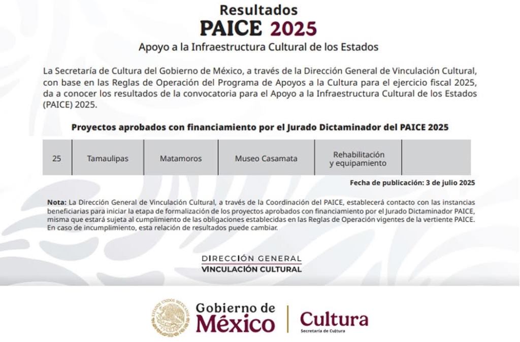 H. Matamoros, Tamaulipas.- El Gobierno de Matamoros, que preside Beto Granados, informó con orgullo que el Museo Casamata ha sido seleccionado dentro del Programa de Apoyo a la Infraestructura Cultural de los Estados (PAICE) 2025, impulsado por la Secretaría de Cultura del Gobierno de México. Esta selección representa un paso fundamental para seguir preservando uno de los espacios más emblemáticos de la ciudad.