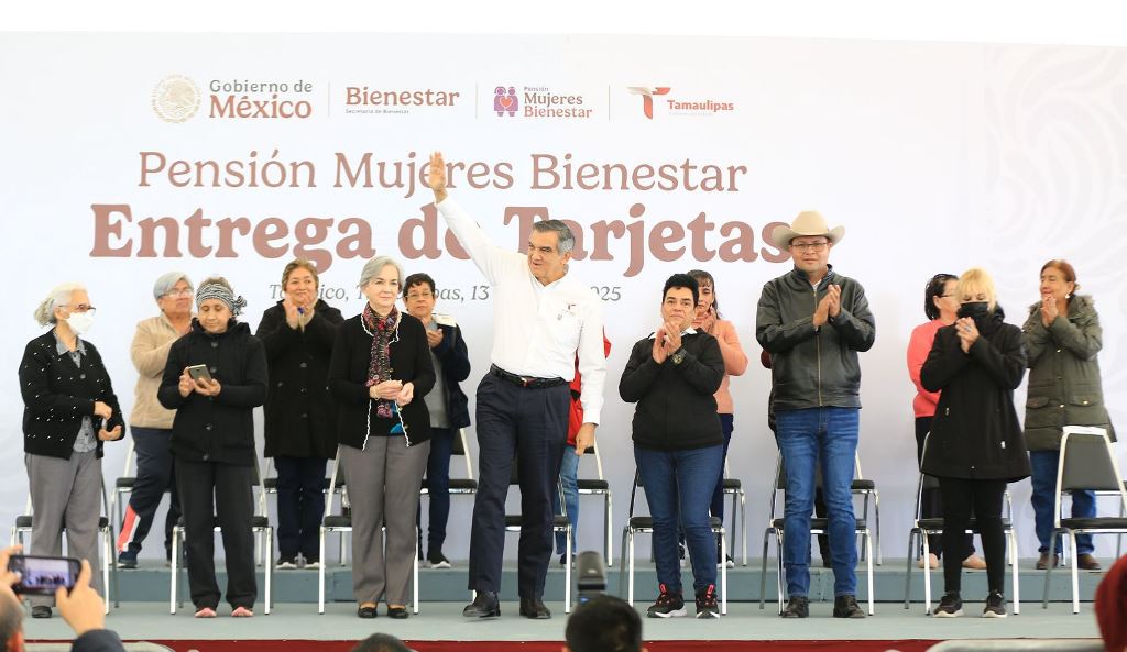 Acompañado por la presidenta del DIF Estatal, doctora María de Villarreal, el gobernador presidió la entrega de la primera remesa de tarjetas 2025 del programa Pensión Mujeres Bienestar, en la velaria de la Expo Tampico, donde destacó que en el presente año Tamaulipas se suma a los tres nuevos programas sociales que impulsa la presidenta de México.