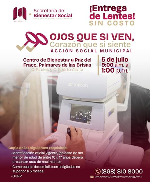 Este sábado 5 de julio se realizará una entrega gratuita de lentes para personas de todas las edades que requieren apoyo para mejorar su salud visual. La jornada tendrá lugar en el Centro de Bienestar y Paz ubicado en el Fraccionamiento Palmares de las Brisas, sobre las calles Pirules y Puerto Arista. El horario de atención será de las 9:00 de la mañana a 1:00 de la tarde.