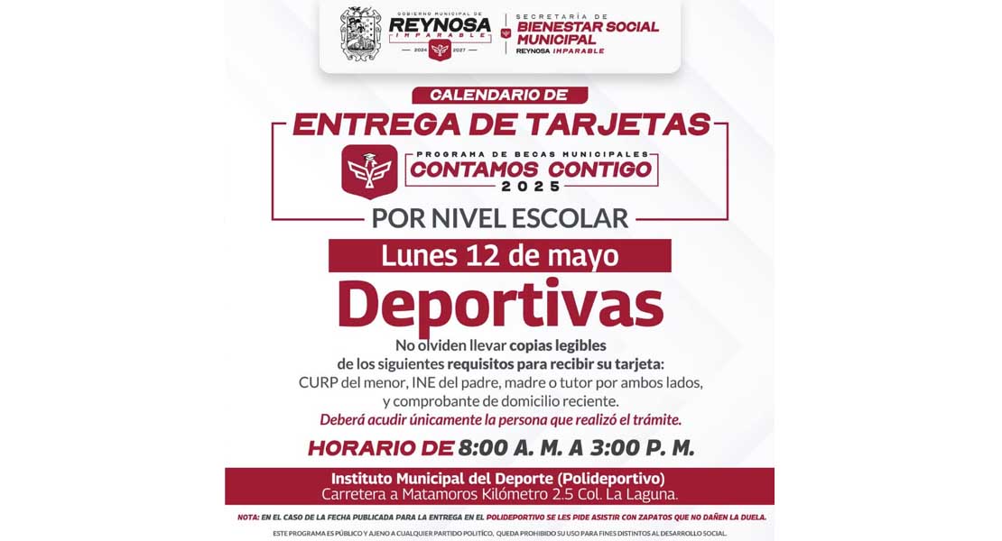 Reynosa, Tam.- El próximo lunes 12 de mayo, el Alcalde Carlos Peña Ortiz entregará las tarjetas del Programa de Becas Municipales “Contamos Contigo” 2025, destinadas a apoyar a los niños y jóvenes deportistas de Reynosa. La entrega de los apoyos se llevará a cabo en el Polideportivo Reynosa, de 8:00 A. M. a 3:00 P. M.
