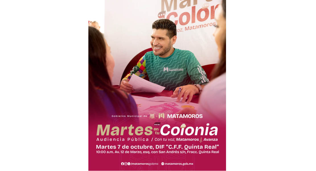 H. Matamoros, Tamaulipas.- El alcalde Beto Granados encabezará este “Martes en tu colonia”, realizado en el DIF Centro de Fortalecimiento Familiar de Quinta Real, ubicado en 12 de marzo, esquina con San Andrés .