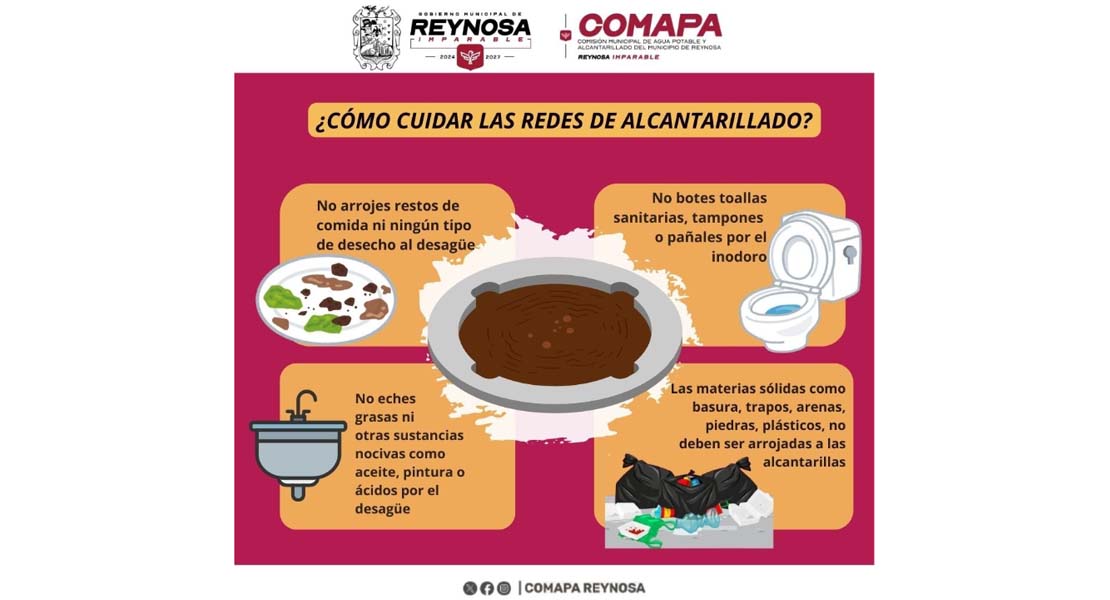 Reynosa, Tam.- La Comisión Municipal de Agua Potable y Alcantarillado de Reynosa hace un llamado a las y los usuarios para fortalecer el cuidado del sistema sanitario, recordando que su buen funcionamiento depende en gran medida de las acciones que se realizan dentro de cada hogar.