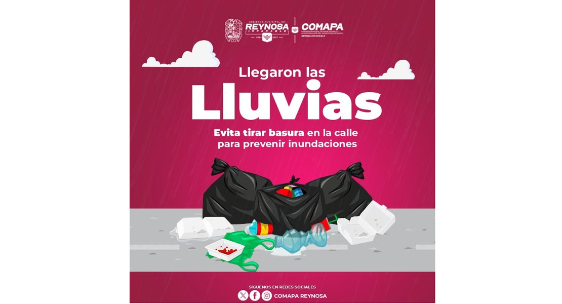 Reynosa, Tam.- La Comisión Municipal de Agua Potable y Alcantarillado de Reynosa hace un llamado a la ciudadanía a evitar tirar basura en la vía pública, especialmente durante esta temporada de lluvias, ya que los desechos pueden obstruir las alcantarillas y redes de drenaje sanitario, provocando encharcamientos e inundaciones.