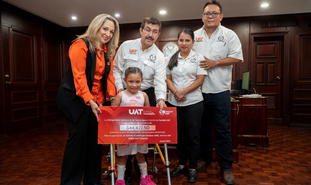 Ciudad Victoria, Tam.- En un emotivo acto que refleja el compromiso social de la Universidad Autónoma de Tamaulipas con la inclusión y el bienestar de las familias universitarias, el rector Dámaso Anaya Alvarado y su esposa, Lic. Isolda Rendón de Anaya, presidenta de Familia UAT, entregaron un donativo que será destinado a apoyar la salud de la pequeña Natalia Guadalupe Campos Solís, quien, recientemente, concluyó su educación preescolar en el Centro de Desarrollo Infantil (CENDI UAT) en Ciudad Victoria.
