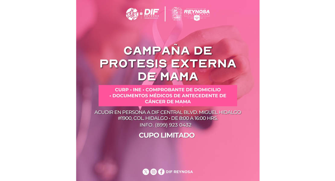Reynosa, Tam.- Como parte de las actividades del mes Rosa, por instrucciones del Alcalde, Carlos Peña Ortiz, el Sistema DIF-Reynosa que preside Carlos Luis Peña Garza, invita a las mujeres que han enfrentado la lucha contra el cáncer de mama a participar en la campaña de Prótesis Externa de Mama, para apoyar su recuperación física y emocional, brindando alternativas que mejoren su calidad de vida.