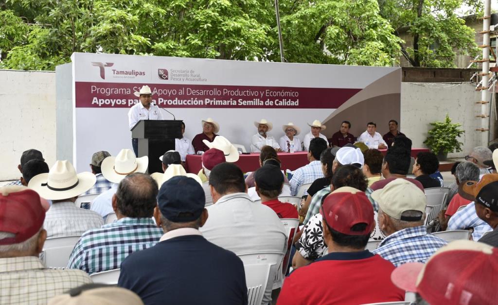 La entrega fue encabezada por el subsecretario de Desarrollo Agrícola, Eliseo Camacho Nieto, en representación del titular de la dependencia estatal, Antonio Varela Flores. Durante el evento, Camacho Nieto destacó que el gobernador del estado, Américo Villarreal Anaya, ha destinado un presupuesto de 24 millones de pesos para el programa de semilla, con el objetivo de beneficiar a un total de 3 mil productores distribuidos en diversos municipios de Tamaulipas.
