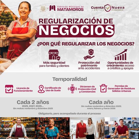 Asimismo, el Gobierno de Beto Granados pone a disposición de la ciudadanía información sobre la clasificación de negocios, los beneficios y la temporalidad de cada trámite, reafirmando que el comercio es una parte esencial del crecimiento de la ciudad. Con la participación de todas y todos, Matamoros avanza y se fortalece como una ciudad con mayor orden, oportunidades y bienestar compartido.