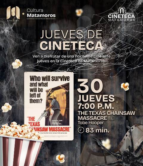 Matamoros, Tam.- En vísperas de Halloween, el Gobierno de Matamoros, que encabeza el alcalde Beto Granados, invita a la ciudadanía a disfrutar de una función especial de los Jueves de Cineteca, con la proyección del icónico filme The Texas Chainsaw Massacre, dirigido por Tobe Hooper.