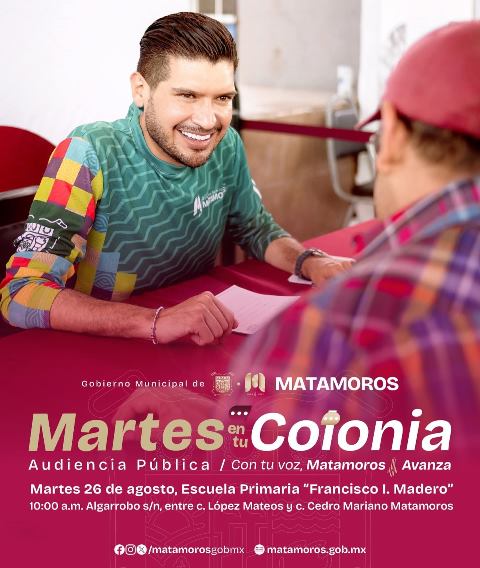 H. Matamoros, Tamaulipas.- El Gobierno Municipal de Matamoros invita a la ciudadanía a participar en la Audiencia Pública que se llevará a cabo este martes 26 de agosto, en la Escuela Primaria Francisco I. Madero, ubicada en Algarrobo s/n, entre López Mateos y Cedro, Colonia Mariano Matamoros, a partir de las 10:00 de la mañana.